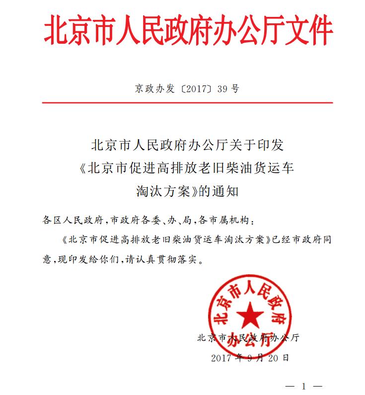北京市人民政府辦公廳關(guān)于印發(fā)《北京市促進(jìn)高排放老舊柴油貨運車(chē)淘汰方案》的通知
